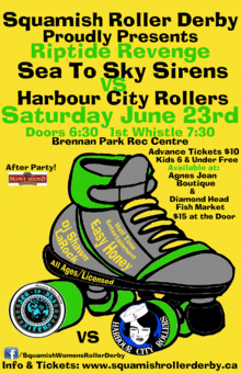 More Squamish roller derby action as the Sea to Sky Sirens take on the Harbour City Rollers from Nanaimo in the second home bout of the season. Come out to cheer on your favorites as they take to the track - doors at 6:30 and the game gets started at 7:30. This is an all ages licensed event and will feature music by DJ Shawn LaRock, Halftime Entertainment by a great band - Easy Honey, and a beer garden with lots of great Howe Sound Brewing beer!