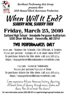 "When Will It End: Slavery Then, Slavery Now" is a thought provoking dance musical wrapped in the effervescence and energy of the electrifying Northeast Performing Arts Group. How are todays youth challenged by decades of lack of knowledge? Come experience an educational expression of Afro American History from Africa to America, depicting different forms of slavery through music, song and dance. How do we break the chains? Come to be entertained, educated, and uplifted by performers ranging from ages 3 thru 25 years of age.