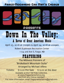 Come join the Fargo-Moorhead Gay Mens Chorus for our spring concert, "Down in the Valley: FMGMC Presents a Revue of Great American Music" under the direction of Angel Lira. This concert will take you through a varied tour of music that has been a part of the American landscape over the years. From western classics to show tunes, you are sure to enjoy each piece we present. You will hear songs you recognize, and you will be introduced to new American composers! We hope the concert will be a testament to the greatness of our country and the Red River Valley! Come join us; you'll be glad you did!
