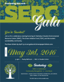 Please join us at the 2016 SERC Gala for a celebratory evening honoring UC Berkeley's Student Environmental Resource Center (SERC), The Green Initiative Fund (TGIF), and student sustainability community. The Gala will also recognize ASUC Sustainability Team's (STeam) 10 year anniversary as an environmental student organization, and SERC's invaluable campus and community partners.