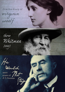Each piece offers a unique view of the authors inner worlds: Whitman is exuberant and rhapsodic, exploring the invisible connections between people both known and unknown; Housman despairs over a rejected and unspeakable love; and Woolf gradually approaches her suicide as she breaks down due to mental illness and depression. Mezzo-sopranos Caitlin McKechney and Hannah McDermott portray Virginia Woolf and Walt Whitman, respectively, and baritone Matthew Walsh portrays A. E. Housman in this staged trio of works, bringing these complex characters, and the genre of art song, to life in an unconventional and engaging way.