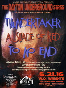 This month, we're bringing you a showcase packed with fantastic music from To No End, A Shade of Red, and ThunderTaker! There will also be a very special surprise duet between 2 of the sets, so don't even think about missing the show! * We'll be collecting more donations for Helping the Homeless Dayton Ohio Making A Difference! Don't be afraid to stop in and "drop off" your donation! ** Come early and have some delicious food! http://www.wowrights.com/menu.php ------------------------------------- * $8 Advance Tickets - Available from all performing bands (soon!) 1st 100 tickets will receive a FREE, exclusive 6 track download! * Purchase tickets online at www.daytonundergroundaltrock.brownpapertickets.com (Print at home, by mail, and will call available) * $10 Day of Show Tickets * 18+ w/ ID * Doors at 830pm; Show at 930pm ==================================== TO NO END - Alternative Rock - These nationally-recognized, Middletown natives have relentlessly churned out a unique brand of aggressive alternative blues rock since 2012. With a trilogy of albums & music videos featuring top Hollywood talent, these guys have covered a metric-ton of ground in a short time! Burning up the stage EVERY time they perform, To No End is sure to start this night off right! http://tonoend.com/