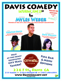 Myles Weber is the 2012 Bay Area Comedy Competition winner. His CD "Lighter Than Mayonnaise" debuted Top 20 in iTunes. He also won his 5th grade stand-up comedy competition. Destined for hilarity, Myles Weber headlines the second Davis Comedy show at Bistro 33! Saturday, June 23rd!