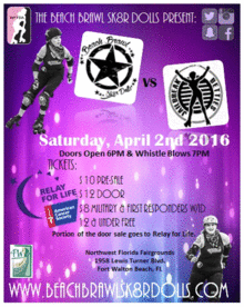 Come on out and see your local Beach Brawl Sk8r Dolls take on the Tallahassee RollerGirls Jailbreak Betties as they derby for an awesome cause Relay for Life.