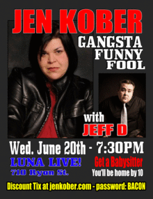 Jen Kober currently lives in Los Angeles, CA where she continues to develop new material and travel the globe spreading mass amounts of laughter world-wide with both her stand-up and improvised comedy shows. Jen loves Yoo-Hoo and ranch flavored Corn-Nuts and wonders why instant gratification takes so long.