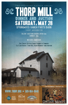 The annual Thorp Mill Dinner and Auction is right around the corner, so mark your calendar and join us for Kittitas County's best Memorial Day activity. We will have live music from Centaur Midwife, Springwood's famous BBQ, beer and wine and of course, strawberry shortcake. All of this in addition to hundreds of items donated by the community in support of this one-of-a-kind historic Thorp treasure. Come for fun, buy for the Mill.