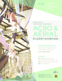 |  | Event2016 Acro and Aerial Spring Student ShowcaseJoin us for the afternoon show (2:00 pm) or and evening show (6:30 pm) at the Bur Oak Brewing Company. This event will feature performances created by Como Acro and Como Aerial Students. Acts will feature Acro Yoga, Aerial Silk, Rope, and Lyra (Aerial Hoop).