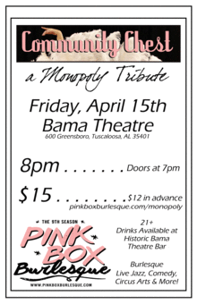 PBB is back at the Historic Bama Theatre for their last show of the Spring with "Community Chest: A Monopoly Tribute!" Burlesque, Live Jazz, Singing, Comedy, Circus Arts and MORE! From Luxury Taxes to Houses on Boardwalk, join the PBB for all things Monopoly on April 15th, 2016!