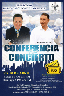 Radio Católica Lawrence - 98.1 WGUA-LP FM te INVITA!!! CONFERENCIA Y CONCIERTO Anímate a compartír con nosotros esta GRAN experiéncia con este ex-pastor Protestante, ahora Doctor de Teólogia Católica, Fernando Casanova, con su apologética carismática. Junto al cantante Católico Pablo Castro. Mas detalles en el flyer. Dios te bendigaaaaa mucho mucho! Cupo limitado!!! Comida incluido!!! Contribucion: $35 9 Y 10 de Abril Sábado 9 AM a 5 PM y Domingo 2 PM a 5 PM North Common Educational Complex (Antigua High School) 233 Haverhill St, Lawrence, MA (ENTRADA ATRAS POR LEBANON ST. [;;CALLE LEBANON];;) INFO: (978) 390-1489 y (978) 397-8112