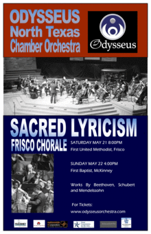 The Frisco Chorale once again joins Odysseus North Texas Chamber Orchestra to perform the exquisite work of Schubert in the Mass in G Major. The orchestra will also perform Beethoven's Coriolan Overture and close the season with Mendelssohn's Symphony No. 4.