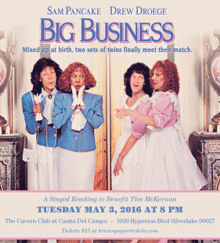 Please join us at the Cavern Club Celebrity Theatre on Tuesday, May 3 at 8 pm for a staged-reading of BIG BUSINESS with Drew Droege as Lily Tomln as the Roses, and Sam Pancake as Bette Midler as the Sadies. Tickets are $15 and we will pass the basket for more donations for this worthy cause on the night, so bring some sweet hot cash money with ya!