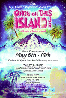 Set in the mystique of the French Antilles archipelago in the Carribbean Sea, this beloved musical weaves elements of the Romeo and Juliet story and of the Hans Christian Andersen fairy tale The Little Mermaid. With almost non-stop dance and music, Once On This Island, Jr., lights up the stage with the tale a young peasant girl who uses the power of love call upon the forces of the gods to wield her future and affect the divide of an Island with two different worlds and social classes.