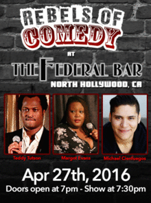 It's Rebels of Comedy at the Federal Bar in North Hollywood. Come out and see a night of live comedy, featuring an awesome lineup of professional features and headliner comedians. Hosted by Teddy Tutson with Headliners Margot Evans, Michael Cienfuegos