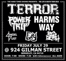 TERROR (L.A. Hardcore Legends, Victory Records) POWER TRIP (TX Thrash, Southern Lord Records) HARMS WAY (Chicago Hardcore, Deathwish inc.) ANGEL DU$T (Baltimore Hardcore-Punk, Pop Wig Records) FURY (So.Cal Hardcore) RED DEATH (D.C. Hardcore-Punk)