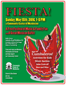 Fiesta is a community party featuring an afternoon of food, music, art activities, and fun that raises money to support the work of the Community Center of Mendocino, Sunday, May 15 from 1 to 5 pm at the Center on the corner of School Street and Pine in Mendocino.