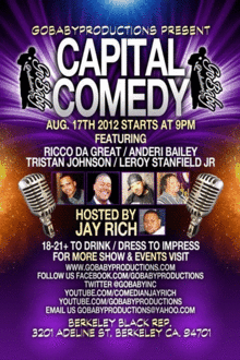 GoBabyProductions proudly present to you Capital Comedy.... This show will have you dying laughing.... A few of the funniest comedians from our state capital have come together to tickle your funny bone....Comedians are Anderi Bailey, Ricco Da Great, and Tristian Johnson. With Host The poet/comedian Jay Rich and guest performance by GobabyProductions very own LeRoy Stanfield.... A night you won't forget