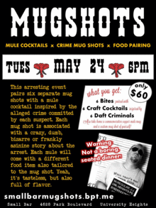 Were pairing six of our favorite dumb crime mug shots with appropriately-themed mule cocktails and pairing with tray passed bites of delicious food.