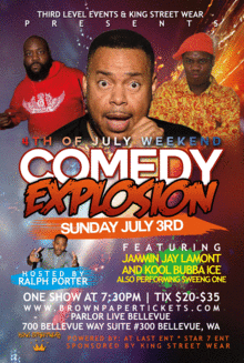 Third Level Events & King Street Wear presents "The 3rd Of July Comedy Explosion 5" Featuring Jammin Jay Lamont And Kool Bubba Ice Also performing Sweeng One and Host Ralph Porter! One show at 7:30pm Tix $20-$35 Www.brownpapertickets.com