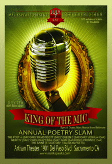 King of the Mic is a poetry slam featuring some of the top poets in california. On June 12th, the poets will converge on stage at the Artisan Theater and compete for the coveted Angela Boyce Trophy...(and $$)