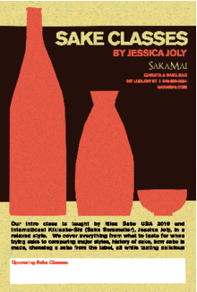 Our intro class is taught by Miss Sake USA 2016 and International Kikisake-Shi (Sake Sommelier), Jessica Joly, in a relaxed style. We cover everything from what to taste for when trying sake to comparing major styles, history of sake, how sake is made, choosing a sake from the label, all while tasting delicious.