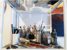 The Ark is empty but in its earliest version it was filled with strange animals, a mutant Noahs Ark. After reading Elizabeth Kolberts The Sixth Extinction I reconsidered. To welcome the Anthropocene, I replaced the cargo of animals with a cargo of ideas represented by the small paintings in the exhibit. These works are an amalgam of my thoughts concerning biology; environmental issues (specific to the Pacific Northwest temperate rain forests where I am from) wild land fires, structure fires, and history- both natural and cultural.