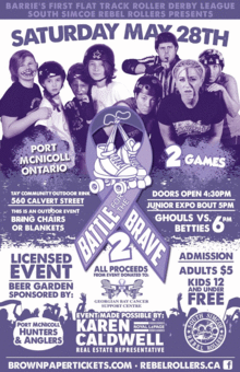 |  | EventSouth Simcoe Rebel Rollers Barries First Roller Derby League Presents: BATTLE FOR THE BRAVE 2 South Simcoe Rebel Rollers Barries First Roller Derby League Presents: BATTLE FOR THE BRAVE 2