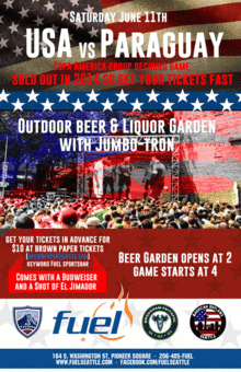 Fuel Sportsbar Outdoor Beer Garden Saturday June 11th 2pm-7pm - USA vs Paraguay viewing party on a huge Jumbo-Tron - Game starts at 4pm. $10 per ticket but comes with a Budweiser and a shot of El Jimador tequila normally priced at $12. Come join the American Outlaws of Seattle and Tacoma along with the Emerald City Supporters and the Seattle Sounders. This will be the party of the year and probably the deciding game to see if our USA Men's National team can advance in the Copa America tournament into the Group stage. The Giant High Def Jumbo-tron is 20 feet wide by 12 feet high. In 2014 this event sold out for USA vs Portugal so get you tickets before there gone. GO USA