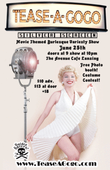 Grab your tickets and some popcorn because Tease is taking you to the movies! Enjoy fabulous live burlesque entertainment all with a movie twist! We will have drink specials, a free photo booth, and a costume contest with prizes from our fabulous sponsors Golden Harvest and The Avenue Cafe! So dress in any movie character or movie themed costume and bring your pals to cheer for you!