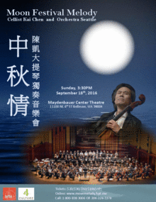 Explore diverse cello music as virtuoso cellist Kai Chen performs Tchaikovsky masterworks including the challenging Rococo Theme Variations with Orchestra Seattle and the passionate Pezzo Capriccioso with piano; Claude Bollings lively Suite for Cello and Jazz Piano Trio; the charming Chinese folk song Flower Dialogue and Heitor Villa-Lobos's Bachianas Brasileiros No.1. Experience the sadness beauty of blind Ah Bing's famous Chinese Erhu music, Reflections of the Moon, in orchestra version with Orchestra Seattle.