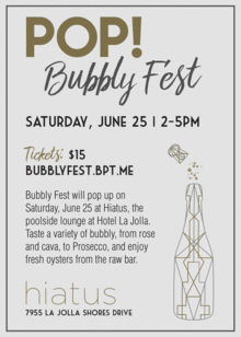 Bubbly Fest will pop up on Saturday, June 25 from 2 to 5 p.m. at Hiatus, the poolside lounge at Hotel La Jolla. Sip premium and unique bubbly brands poolside, from Cava and Rose, to Prosecco, enjoy sparkling cocktails and soak it all up with an oyster bar from Cusp's kitchen.