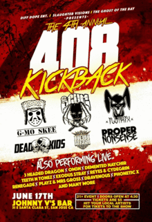 This is it!! The 4th Annual 408 Kickback! And we are bringing out SCUM The GoreFather himself from LSP to headline this year's kickback along with G-MO SKEE & ILLTRIX for the triple threat and with James Butcher as DJ for the show!