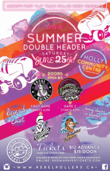Roller Derby! Two Games for the Price of one! Join us on June 25 at the Holly Community Centre for two action packed games. Where the South Simcoe Rebel Rollers Home Teams hit the track! First Game starts at 6pm where our Ghoul Guides will be taking on NCRD Nickel City Roller Derbys Sudbetties. The Second Game our own Boneyard Betties will be going up against RDDs Bombshell Battalion. This licensed event will be entertainment for the whole family. Put on your Purple and Green and cheer for your favorite home team.