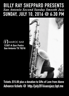 BillyRay Sheppard teams up with San Antonio's finest musicians for this summer's hottest smooth jazz event, Second Sunday Smooth Jazz. As always this is a party with a purpose! Come out and support Gifts of Love from Above San Antonio. This organization supports families of gun violence victims.