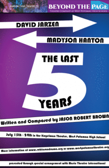 An emotionally powerful and intimate musical about two New Yorkers in their twenties who fall in and out of love over the course of five years. The show's unconventional structure consists of Cathy, the woman, telling her story backwards while Jamie, the man, tells his story chronologically; the two characters only meet once, at their wedding in the middle of the show.