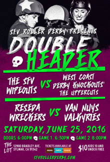 Doors: 6:00PM Game 1 6:30PM: The Wipeouts vs. West Coast Derby Knockouts' Uppercuts Game 2 8:00PM: Reseda Wreckers vs Van Nuys Valkyries