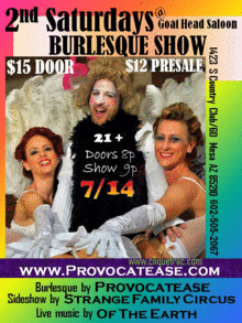 Provocatease pushes the boundaries of risque comedy in order to flame your untamed desires. You'll be teased and titillated by our burlesque dancing beauties, hunky strongmen, singers, circus artists, mind bending magician, danger acts, side show stunts, and live musical guest performances.