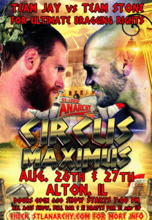 Circus Maximus: Us vs Them Team Gary Jay vs Team Martin Stone Stage 1- August 26th Stage 2 - August 27th Spaulding Hall Club - 402 E 4th St, Alton, Il Doors open at 6:30pm Bell Time 7:00pm Full Bar, $1 Draft Beer, $1 Jello Shots and Food. Advanced Tickets are $15, $12, and $10 per night, but all tickets are $15 at door.