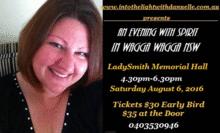 Join natural born Medium and Clairvoyant Danuelle,(Of Into the light with Danuelle) as she delivers messages in a very private setting from the Spirit World! Danuelle is recognised throughout Australia, and is becoming widely known for her clarity in connection and straight forward, no nonsense delivery! Your loved ones will come alive to the room and send forward intimate messages providing validation and existence of the afterlife. Danuelle has continued her study with Mediumship- and visited the prestigious Arthur Findlay College in ENGLAND last year... and among rubbing shoulders and being mentored with some of the worlds most recognised Mediums,is setting an example of her own professional integrity in the field through the ART of communication. Not a demonstration to be missed!