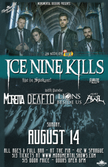 Through the art of intricate song writing and elaborate story telling, Boston MA's Ice Nine Kills have the ability to engage and captivate listeners, winning over a fanatical legion of followers across the nation. Seamlessly weaving aggressive post hardcore with soaring melodies, the ferocious four-piece utilizes multi-textured guitar hooks, a dual vocal attack, complex orchestral arrangements and a pummeling rhythm section, which grabs the listener by the throat and refuses to let go. The drive and dedication of Ice Nine Kills has made a lasting impression on fans both sonically and through their explosive live show, creating a kinetic energy through each performance. Armed with a new collection of songs, Ice Nine Kills stand poised for their biggest chapter yet.