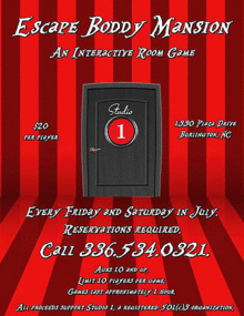 Test your sleuthing skills at Studio 1's summer escape room! Solve the puzzles and collect the clues to escape from "The Boddy Mansion"...and solve a crime.