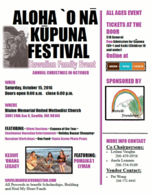 The Manuiki Foundation is once again sponsoring the Aloha O Na Kupuna Hawaiian Family Festival (annual "Christmas in October") on Saturday, October 15, 2016 at the Blaine Memorial United Methodist Church, 3001 24th Ave S, Seattle, WA 98144.