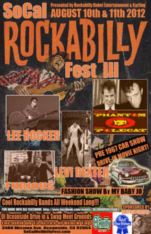 Hosted By Garry D Thayer AKA Rockabilly Rebel Entertainment Co-Hosted By Karling Abbygate Hello Friends ! It's that time again !!!! So Cal Rockabilly Fest 3 & Car Show ( Formerly So Cal Hellbilly Fest ) , will take place in on August 10th & 11th this year in the city of Oceanside , CA at the Ol Oceanside Drive in & Swap Meet Grounds. Located on 13 Acres of Black