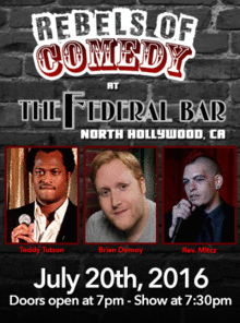 It's Rebels of Comedy at the Federal Bar in North Hollywood. Come out and see a night of live comedy, featuring an awesome lineup of professional features and headliner comedians. Hosted by Teddy Tutson with Headliners Brian Demoy, Rev. Mitcz