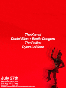Single Lock Recording artists The Kernal, Daniel Elias + Exotic Dangers, The Pollies, and Dylan LeBlanc perform July 27th at Warehouse 414.