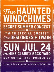 The Haunted Windchimes Secret Summer Concert With special guests: The Deslondes + TWAIN Sunday, July, 24th, 2016 @ 7pm 607 Moffat Ave. Pueblo CO, 81003 (Outdoors / Backyard) Doors at 6:30pm | Tickets $20