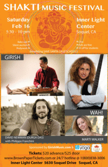 Soquel, CA Saturday February 16, 5:30-10pm Shakti Music Festival Music with Wah!, Girish, David Newman (Durga Das) & Mira with Phillipo Franchini, & Marti Walker Shakti Music Festival Fundraiser for Santa Cruz Schools Inner Light Center 5630 Soquel Drive Soquel, CA 95073 Tickets are $20 in advance, http://www.brownpapertickets.com/event/258374, or 24/7 Ticket Hotline: 1-800-838-3006 and $25 at the door Kids 12 and under free, Students over 12 $3 discount with ID Bake Sale, Chai, bodywork All festival proceeds to benefit Save Santa Cruz Schools