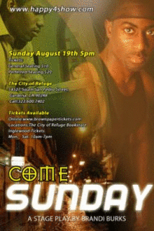 A dramatic play about a mother's hopefulness and struggle to keep her family strong and together. She worries about her son and losing him to the urban jungle in which they live. The Play is full of twists and turns sure to keep you on the edge of your seat, but don't worry, all will be revealed "Come Sunday".