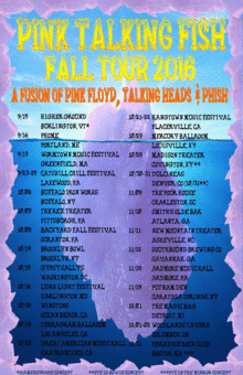 Discovering connections is part of the fun: Pink Floyd's "On The Run" seamlessly fitting in the middle of the composition of Phish's "You Enjoy Myself". Perfectly placing Phish's "Sand" into the groove of The Talking Head's "Slippery People". Segued collections from all three acts such as Run Like Hell > Making Flippy Floppy > Piper > Run Like Hell or Mike's Song > Have A Cigar > Once In A Lifetime > Weekapaug Groove. These ideas are the spirit behind Pink Talking Fish.