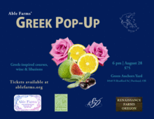 A coursed Greek inspired meal with wine pairing from 1856. Using locally sourced food. Set in the Green Anchors yard overlooking the water by the St. Johns Bridge. Come celebrate Greece!
