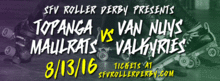 Come out to see two great derby games in one night! First up is our Junior Expo Bout with the SFV Gnarlies vs. the San Diego Derby Dolls Juvenile Dollinquents. After that, the Topanga Maulrats will take on the Van Nuys Valkyries. You won't want to miss it!